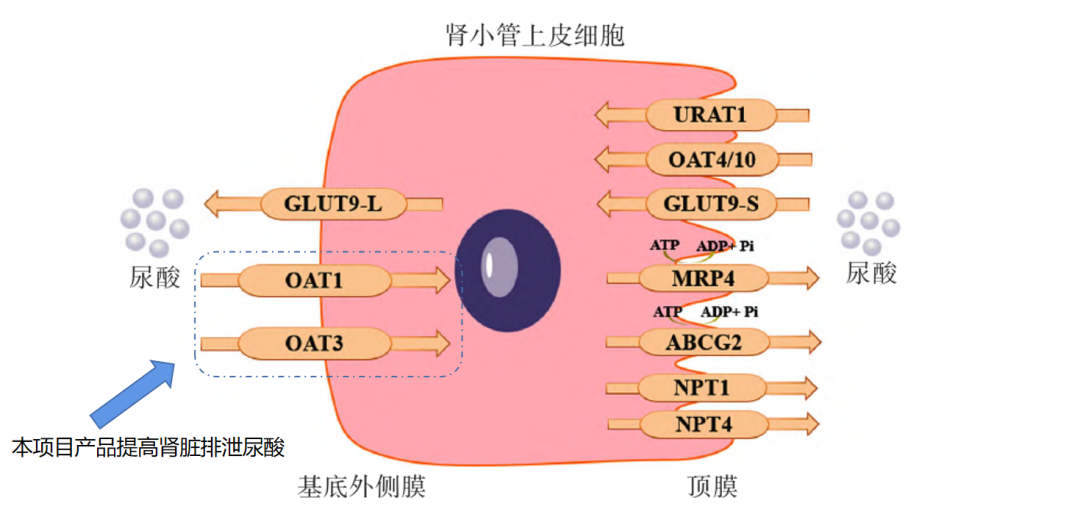 作用机制: 产品激活糖代谢,竞争性抑制葡萄糖-6-磷酸代谢为尿酸的磷酸戊糖途径,从源头上降低尿酸生成。 产品通过激活从血液清除尿酸分子的转运体,加速尿酸进入尿液速度,降低尿酸水平。