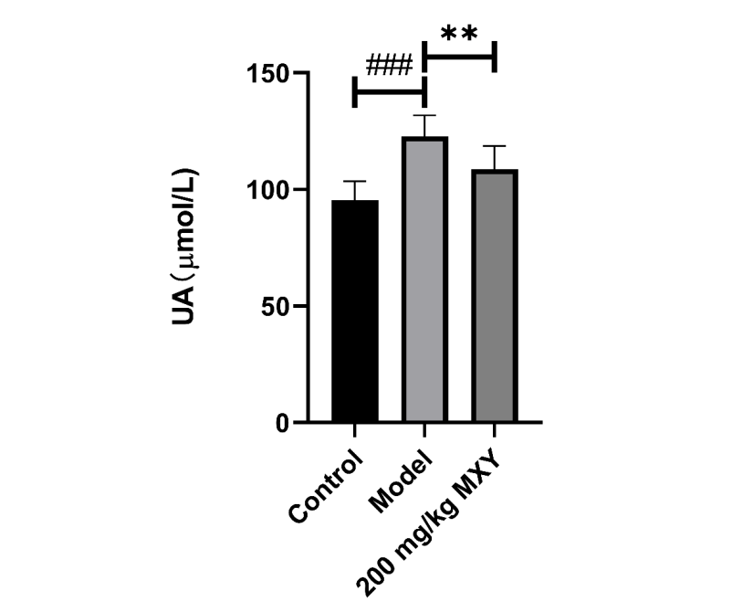 动物试验结果: 食品级产品能够有效降低痛风模型小鼠血尿酸浓度。 UA,尿酸;Control,未建立模型小鼠;Model,痛风模型小鼠;MXY,改善痛风食品。 动物试验结果